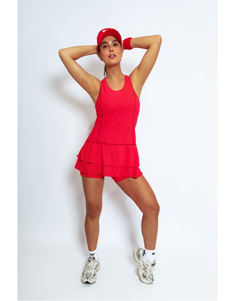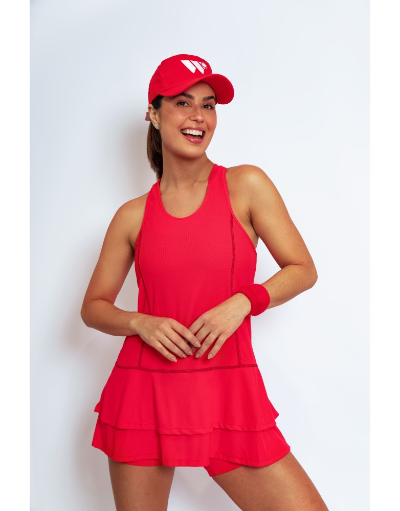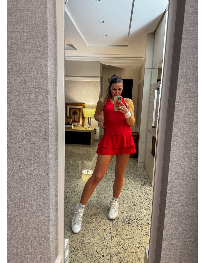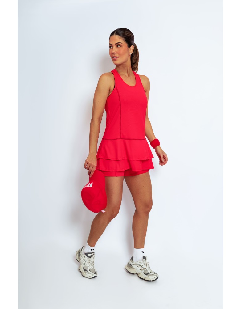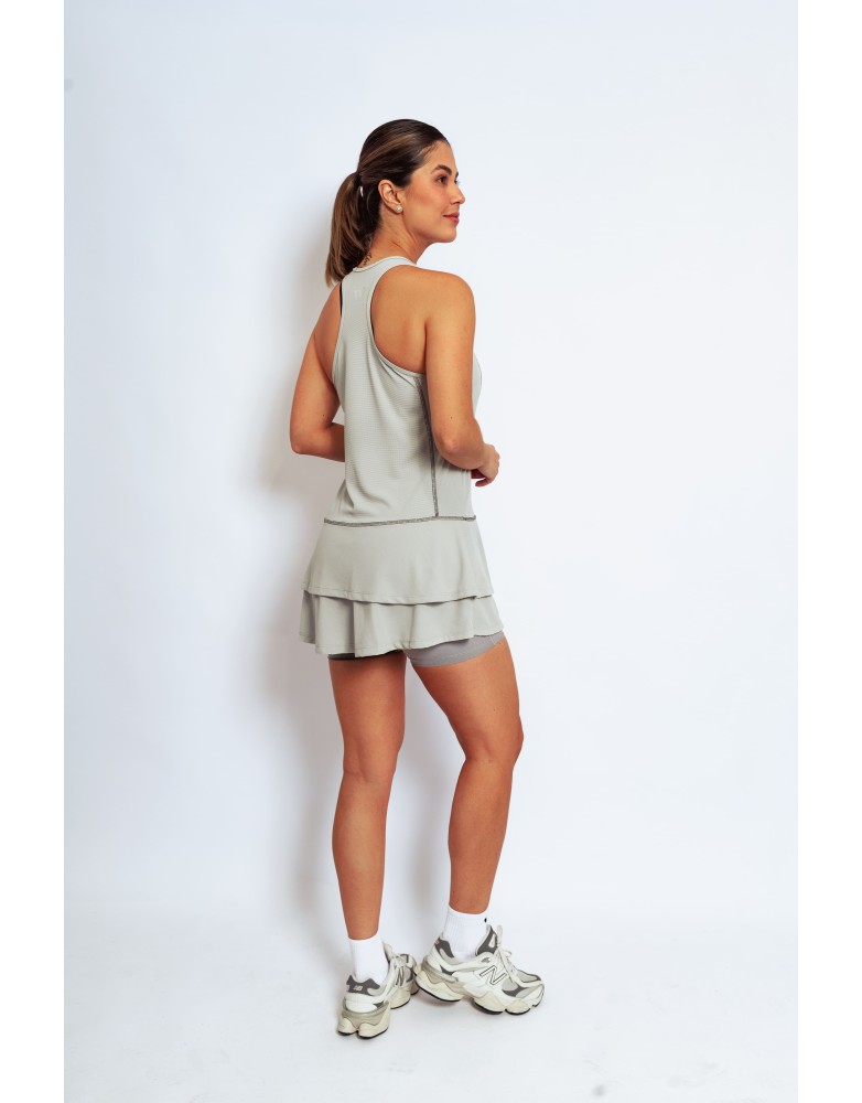 Leve, fluido e com movimento em cada detalhe, possui modelagem reta, recortes laterais anatômicos e acabamento em ponto trançador contrastante, o que valoriza as linhas do corpo e garante um visual moderno.O charme fica por conta dos babados aplicados na saia, que trazem leveza e fluidez a peça. Tecido com textura quadriculado e gramatura média, tem toque macio, caimento suave e sustentação leve, sendo ideal para composições esportivas ou urbanas.